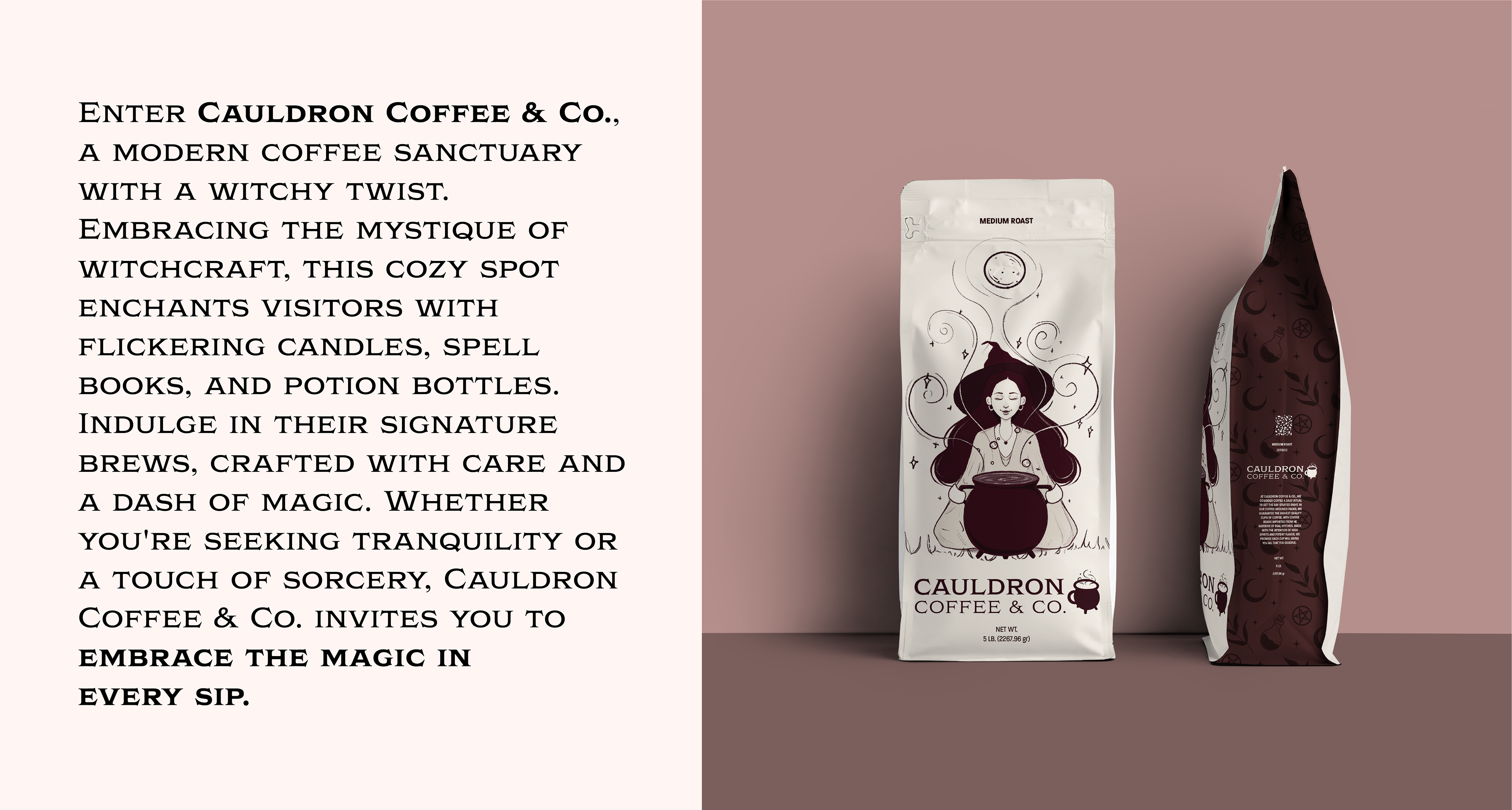 This is a branding design concept for a coffee shop centered around modern witchcraft. Included is the logo, a cauldron mug, coffee grounds pack, to-go coffee cups, a business card, and a shop mockup.